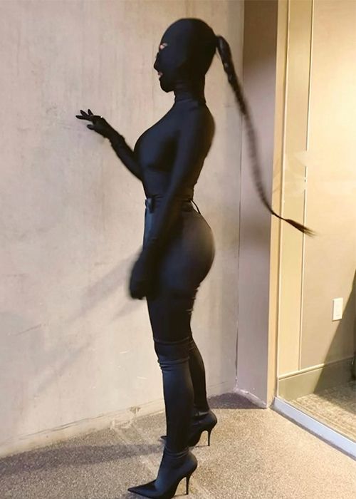 Ngày 8/8, Kim đăng trên Instagram loạt ảnh dự sự kiện ra mắt album Donda của chồng cũ Kanye West ở Atlanta. Người đẹp diện bộ trang phục đen của Balenciaga với áo dài tay, quần bó, mũ trùm kín mặt và giày cao cổ. Cô đi cùng bốn con - North, Saint, Chicago và Psalm.