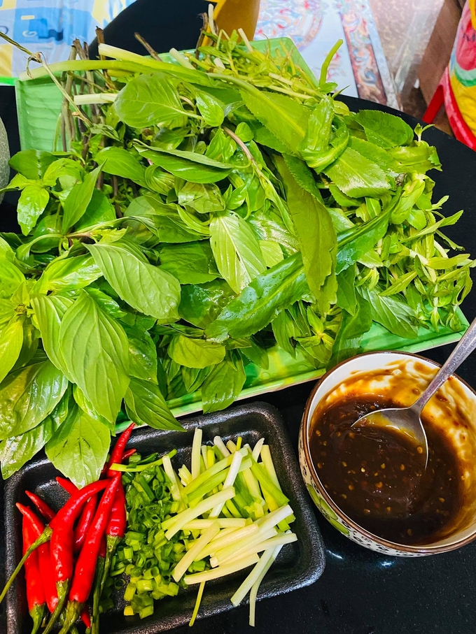 - Hành lá, rau ăn kèm (ngò gai, lá quế), chanh, ớt.