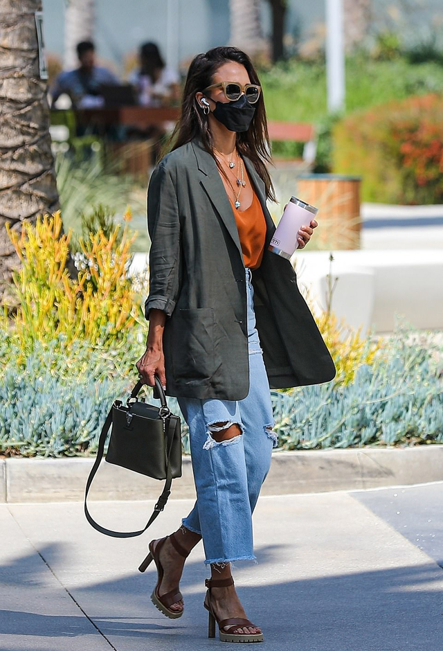 Sau chuyến du lịch với ông xã, Jessica Alba được trông thấy đi làm trở lại hôm thứ ba ở Santa Monica, California. Cô đến công ty trong trang phục năng động và đeo khẩu trang kín tránh dịch giữa bối cảnh số ca nhiễm đang tăng mạnh trở lại.