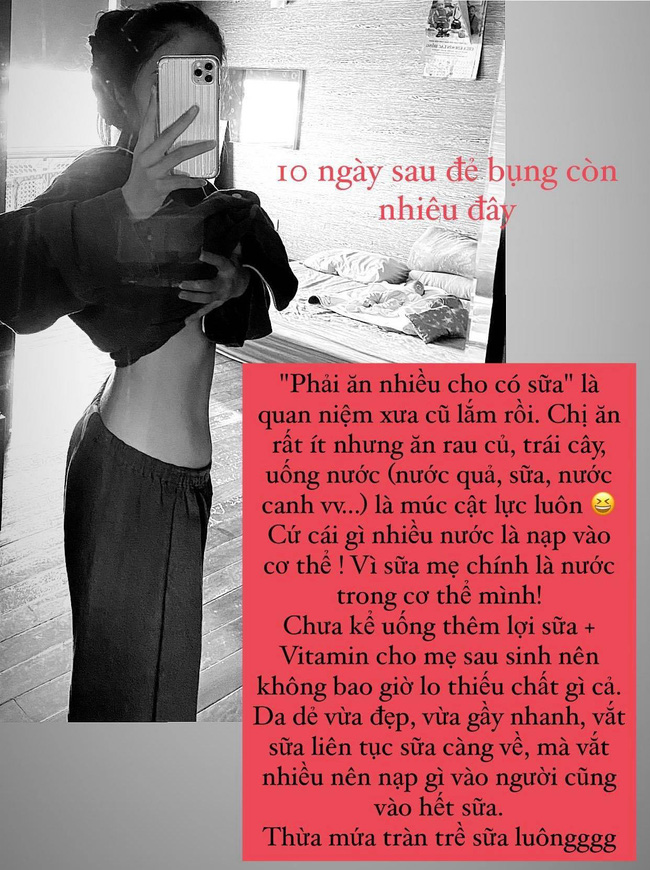 Cô cũng tiết lộ thường xuyên tập luyện thể dục nhẹ nhàng ngay từ khi mang bầu. Hơn nữa, cần ăn uống chế độ hợp lý, lành mạnh để có body săn chắc chứ không chảy xệ sau khi sinh.