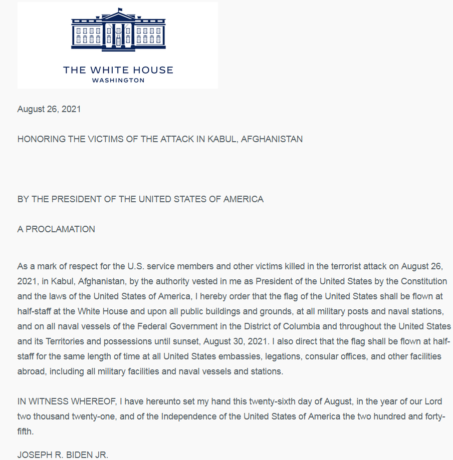 Just one thing to note at the top: As a mark for our respects, starting today, the United States flag will be flown at half-staff at the White House and upon all public buildings and grounds, at all military posts and naval stations, and on all naval vessels of the federal government in the District of Columbia and throughout the United States and its territories, and possessions until sunset on April -- August 30th -- excuse me -- 2021, in honor of the victims of the senseless acts of violence in Kabul, Afghanistan.