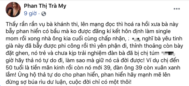 Cụ thể, nguyên văn bài viết của Trà My như sau: "Thấy rần rần vụ bà Khánh Thi, lên mạng đọc thì hoá ra hồi xưa bà này bẫy Phan Hiển có bầu mà không được đăng kí kết hôn định làm 'single mom' rồi xong nhà ông kia cuối cùng chấp nhận. Nghĩ bà yêu tinh già này đã bẫy được phi công rồi thì yên phận đi, thỉnh thoảng còn bày đặt ghen, nó trẻ và chưa kịp trải nghiệm đàn bà đã bị chị túm, giờ hãy thả nó tự do đi, làm sao mà giữ nó cả đời được! Ví dụ chị đến 50 tuổi là tiền mãn kinh rồi còn nó mới 39, đàn ông 39 còn xuân xanh lắm! Ủng hộ thả tự do cho Phan Hiển, Phan Hiển hãy mạnh mẽ lên đừng sợ búa rìu dư luận, cuộc đời chỉ có một thôi!".