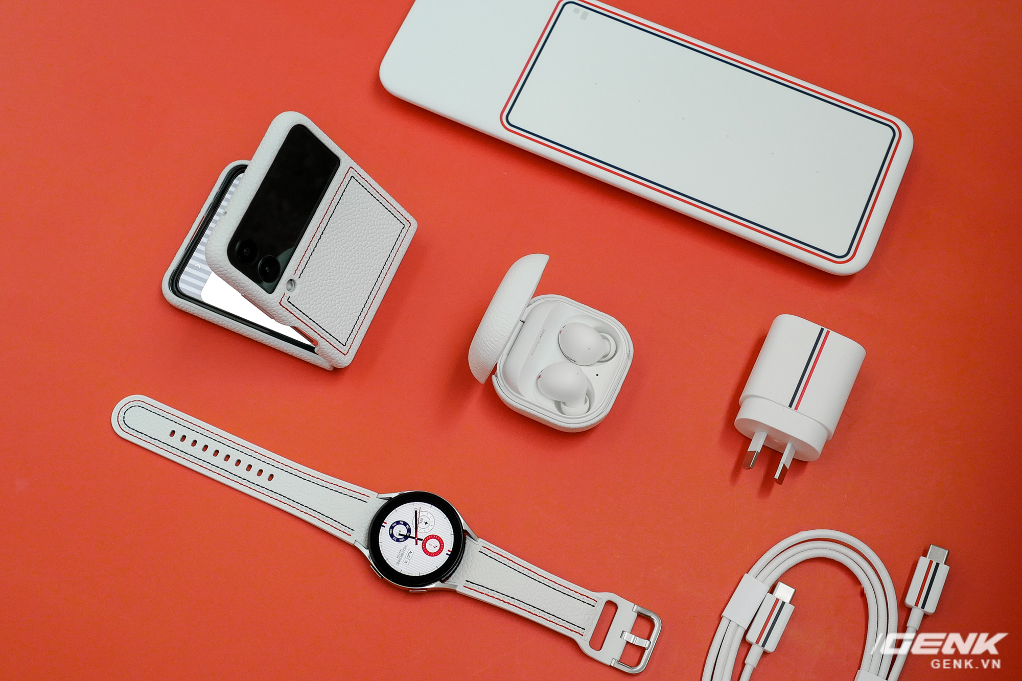 Galaxy Z Fold3 và Z Flip3 phiên bản Thom Browne mang một thiết kế đặc biệt với tông màu trắng và những đường bao xanh-đỏ. Quan trọng hơn, đi kèm với máy, người dùng còn nhận được một bộ đầy đủ các sản phẩm vừa ra mắt của Samsung gồm Galaxy Watch4, Galaxy Buds2 và bút S Pen với mang phong cách thiết kế tương tự. Thậm chí, ngay những phụ kiện nhỏ nhất như củ sạc hay cáp USB-C cũng được thiết kế riêng.