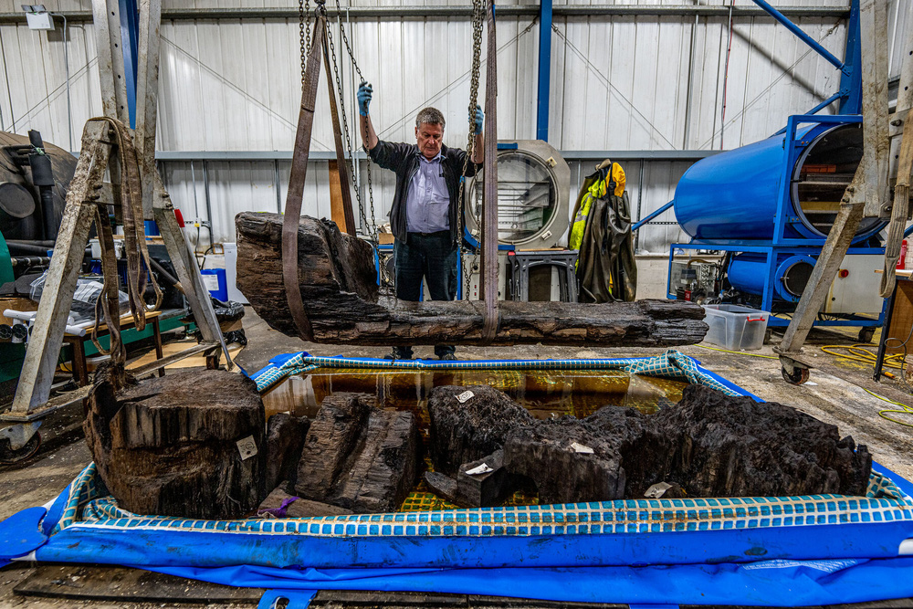 Ian Panter, người đứng đầu bộ phận bảo tồn tại York Archaeological Trust, với chiếc quan tài bằng gỗ (vỡ ra nhiều mảnh) thời kỳ Đồ đồng được phát hiện trên một sân gôn ở Anh vào năm 2018. Ảnh: Charlotte Graham