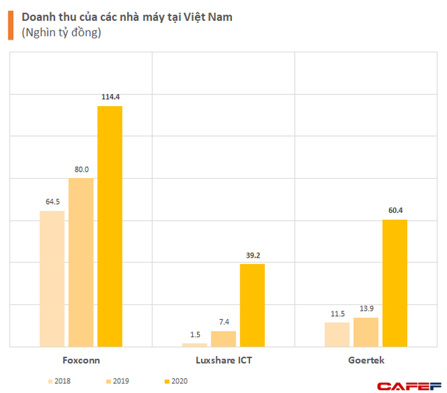 Doanh thu của Foxconn, Luxshare và Goertek tại Việt Nam đều tăng thêm trên 1 tỷ USD trong năm 2020