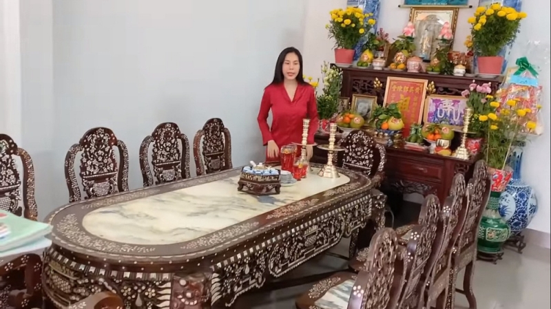 Đáng chú ý là bộ bàn ghế từ gỗ xà cừ với họa tiết hoa mai trăm tuổi nằm trong phòng thờ cúng. Thủy Tiên cũng nói thêm, có người từng 'ngã giá' 400 triệu đồng cho bộ bàn ghế cổ xưa này, nhưng mẹ Thủy Tiên không đồng ý bán.