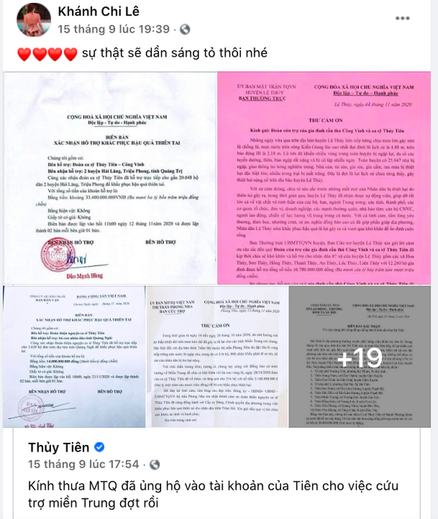 Trên Facebook cá nhân, Khánh Chi đã liên tục chia sẻ bài đăng từ Fanpage của chị dâu Thuỷ Tiên để thể hiện sự ủng hộ và tin tưởng hết lòng. Không chỉ thế, em gái Công Vinh còn thốt lên 3 chứ "Đã cái nư" khi đọc thông tin luật sư sẽ vào cuộc để đòi lại công bằng, danh dự cho vợ chồng Thuỷ Tiên.