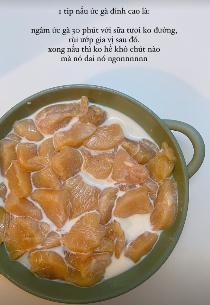 Hà Trúc nhận thấy việc ngâm ức gà với sữa tươi không đường giúp loại thịt này bớt bị khô, dai và thơm ngon hơn.