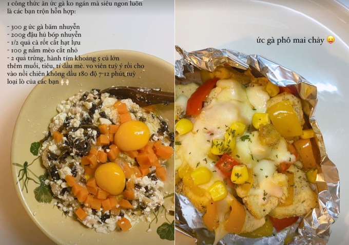 Hà Trúc thay đổi thực đơn tăng cơ với đủ kiểu chế biến như ức gà nướng, ức gà lăn yến mạch bằng nồi chiên không dầu, thịt viên ức gà... để bữa ăn bớt nhàm chán.