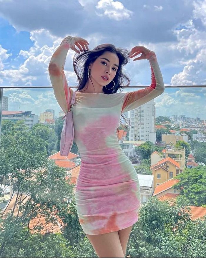 Chi Pu khoe thân hình quả lê quyến rũ với bộ váy body tay dài có thiết kế màu sắc tie-dye ấn tượng.