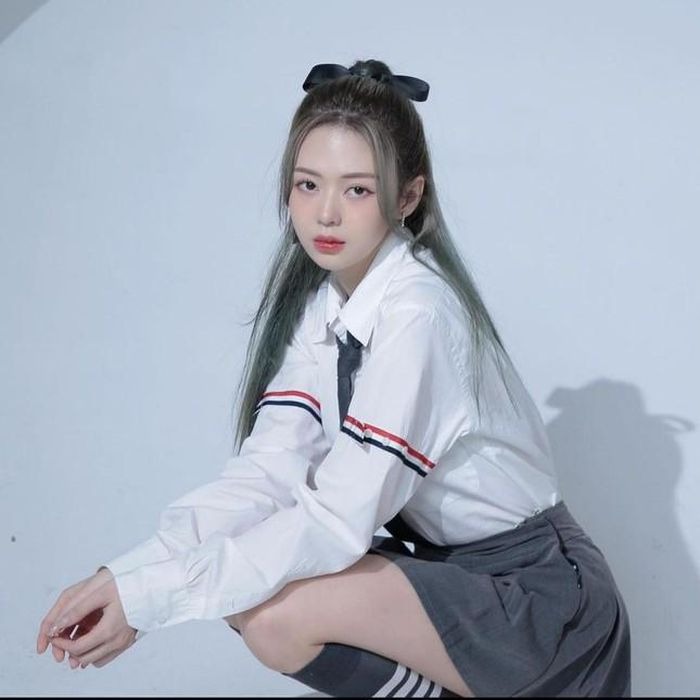 Liz Kim Cương diện áo sơ mi trắng cùng chân váy tennis màu xám, đeo cà vạt theo style nữ sinh.