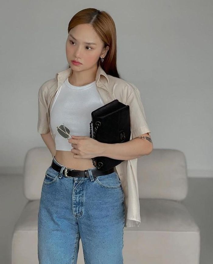 Jun Vũ khéo léo khoe ưu điểm eo thon với áo hai dây crop-top, mix cùng quần jeans và áo sơ mi khoác ngoài năng động.