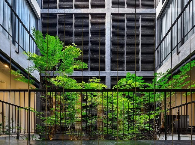 Điểm nhấn trong kiến trúc của ngôi nhà chính là khoảng thông tầng kết hợp giếng trời rộng lớn được thiết kế ở chính giữa. Đây là giải pháp lấy sáng hiệu quả và mang lại khe thoáng cho những ngôi nhà ống. Tại đây, gia chủ thiết kế thêm một vườn cây xanh, vừa mang đến bóng mát, vừa giảm cảm giác ngột ngạt của một công trình nhà phố.