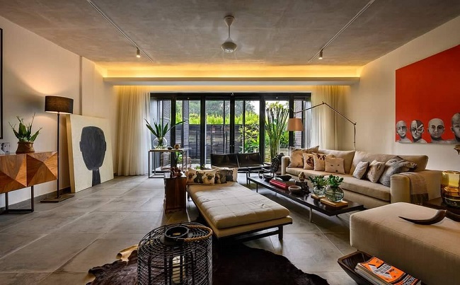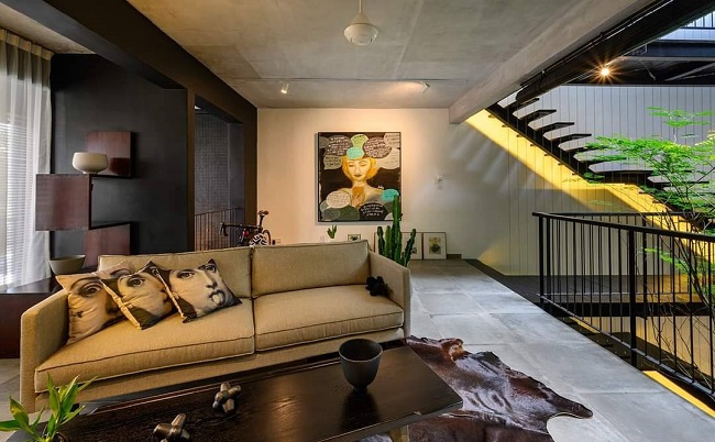 Đằng sau cánh cửa ngôi nhà mở ra một không gian sống vừa sang trọng vừa cá tính. Đơn vị thiết kế sử dụng xen kẽ sàn xi măng trần và tường bê tông sơn sáng màu và sơn đen để ngôi nhà trông không quá tối.