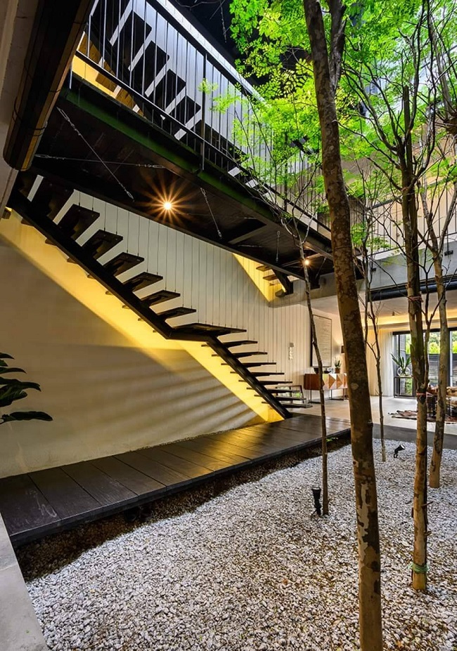 Không chỉ có vườn cây, trục giao thông chính là ngôi nhà là cầu thang cũng được đặt tại khu vực thông tầng này. Cầu thang được làm bằng gỗ sơn đen, hòa quyện cùng tay vịn cầu thang kim loại, mang đến sự kết hợp vừa cổ điển, vừa hiện đại.