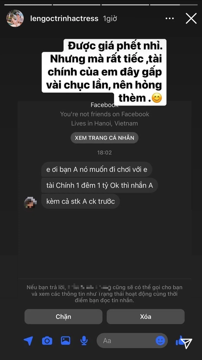 Mới đây, nữ diễn viên Lê Ngọc Trinh chia sẻ trên trang cá nhân đoạn tin nhắn cô nhận được từ một tài khoản lạ với nội dung mời đi chơi và tặng số tiền khủng là 1 tỷ/đêm.