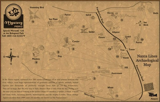 Các đường kẻ Nazca Lines được tìm thấy trên sa mạc cách Lima, Peru được xem là hiện tượng rất bí ẩn. Các đường kẻ này nằm trên một vùng đất dài và rộng lớn được con người phát hiện ra đầu thập niên 30 ở thế kỷ trước. Những đường thẳng này rất hoàn hảo, chạy thẳng và đôi lúc chạy song song với nhau, nhìn từ xa trông giống như một đường băng hay hình con chim khổng lồ được khắc họa trên mặt đất. Nhiều giả thiết cho rằng, hình vẽ này là dùng để nhận biết độ cao, dùng cho dự báo thời tiết hoặc có thể là cho mục đích tín ngưỡng…
