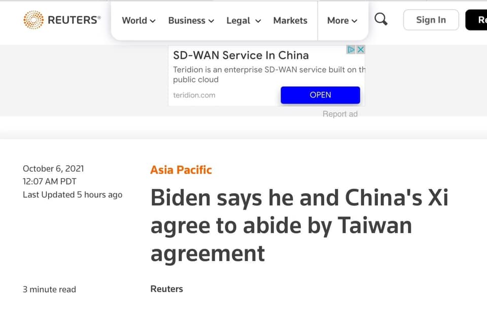 Trong khi căng thẳng giữa Đài Bắc và Bắc Kinh đang gia tăng , Joe Biden hôm thứ Ba cho biết ông ta đã nói chuyện với Chủ tịch Trung Quốc Tập Cận Bình về Đài Loan và họ đồng ý tuân theo "thỏa thuận Đài Loan",