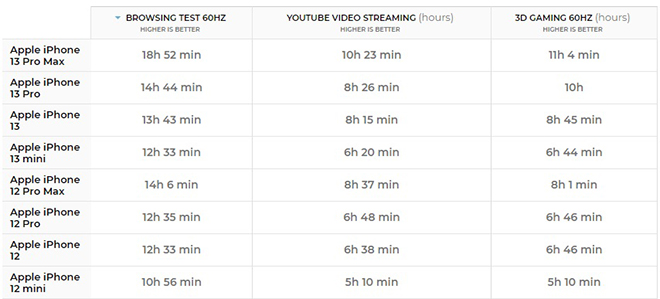 Đây là thông tin thu hút nhiều sự chú ý khi dòng iPhone 13 được giới thiệu. Công ty không cung cấp con số dung lượng pin trên trang web của mình nhưng các bài kiểm tra/ đo lường từ các chuyên gia đã hé lộ dung lượng thực tế. Theo đó, chiếc iPhone 13 Pro Max có mức tăng dung lượng pin lớn nhất.