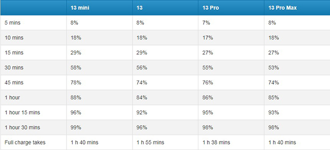 Tốc độ sạc của dòng iPhone 13.