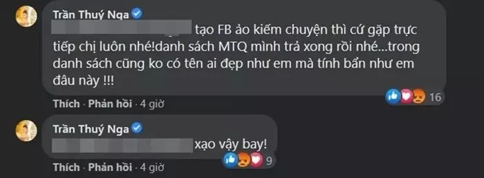 Liên tục bị réo tên, Thúy Nga liền lên tiếng phản bác: "Tạo Facebook ảo kiếm chuyện thì gặp trực tiếp chị luôn nhé. Danh sách mạnh thường quân mình trả xong rồi nhé. Trong danh sách cũng không có ai tên đẹp như em mà tính bẩn như em đâu này", "Xạo vậy bây", "Để chụp hình câu này báo cảnh sát có đứa bạo hành phụ nữ nè”.