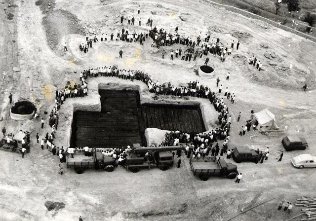 Sau hơn 60 ngày khai quật, và rút cạn nước bên trong, cuối cùng ngôi mộ bị nhấn chìm hàng nghìn năm đã lộ diện. Cách bài trí của lăng mộ này giống như một ngôi nhà ba gian hiện đại.