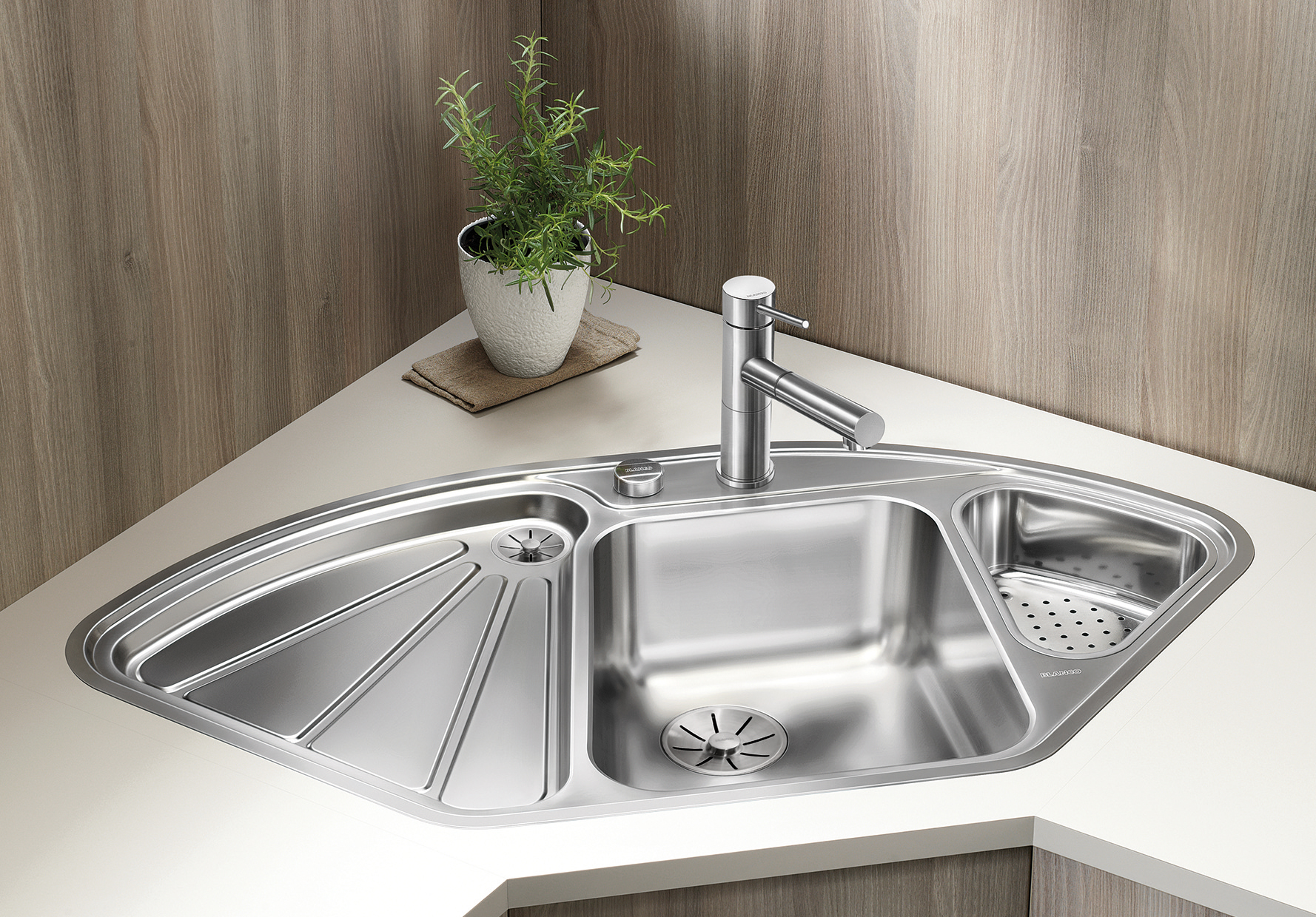 Nếu may mắn sở hữu diện tích phòng bếp rộng rãi, việc lựa chọn bồn rửa sẽ trở nên đơn giản hơn. Song, nếu nhà bếp nhỏ, bồn rửa góc (còn gọi là bồn rửa cánh bướm) là lựa chọn khá tiết kiệm không gian.