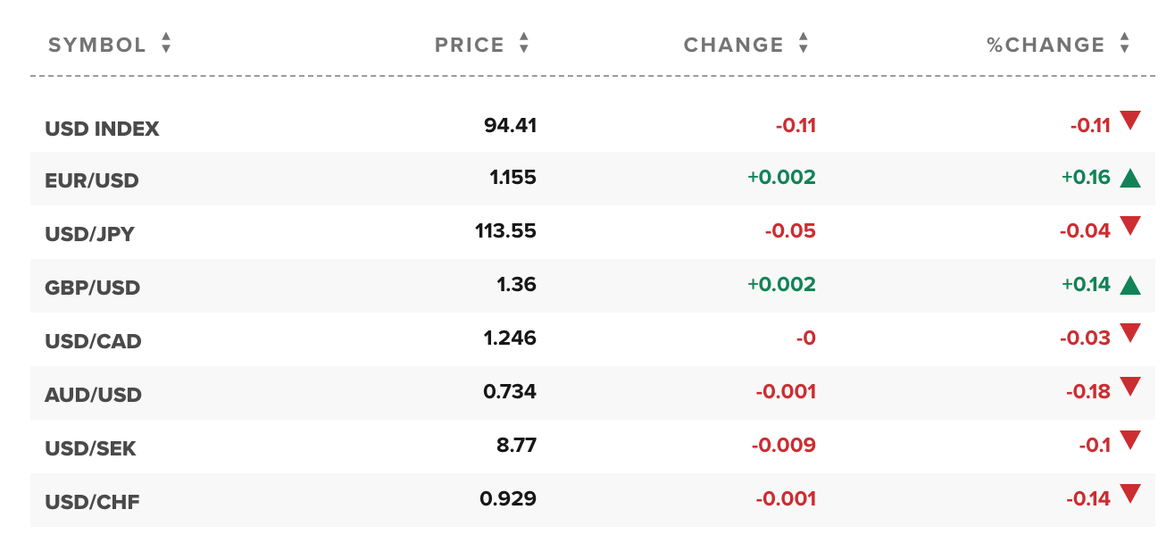 Giá USD và tỷ giá ngoại tệ các đồng tiền trong rổ tiền tệ thế giới (nguồn CNBC)
