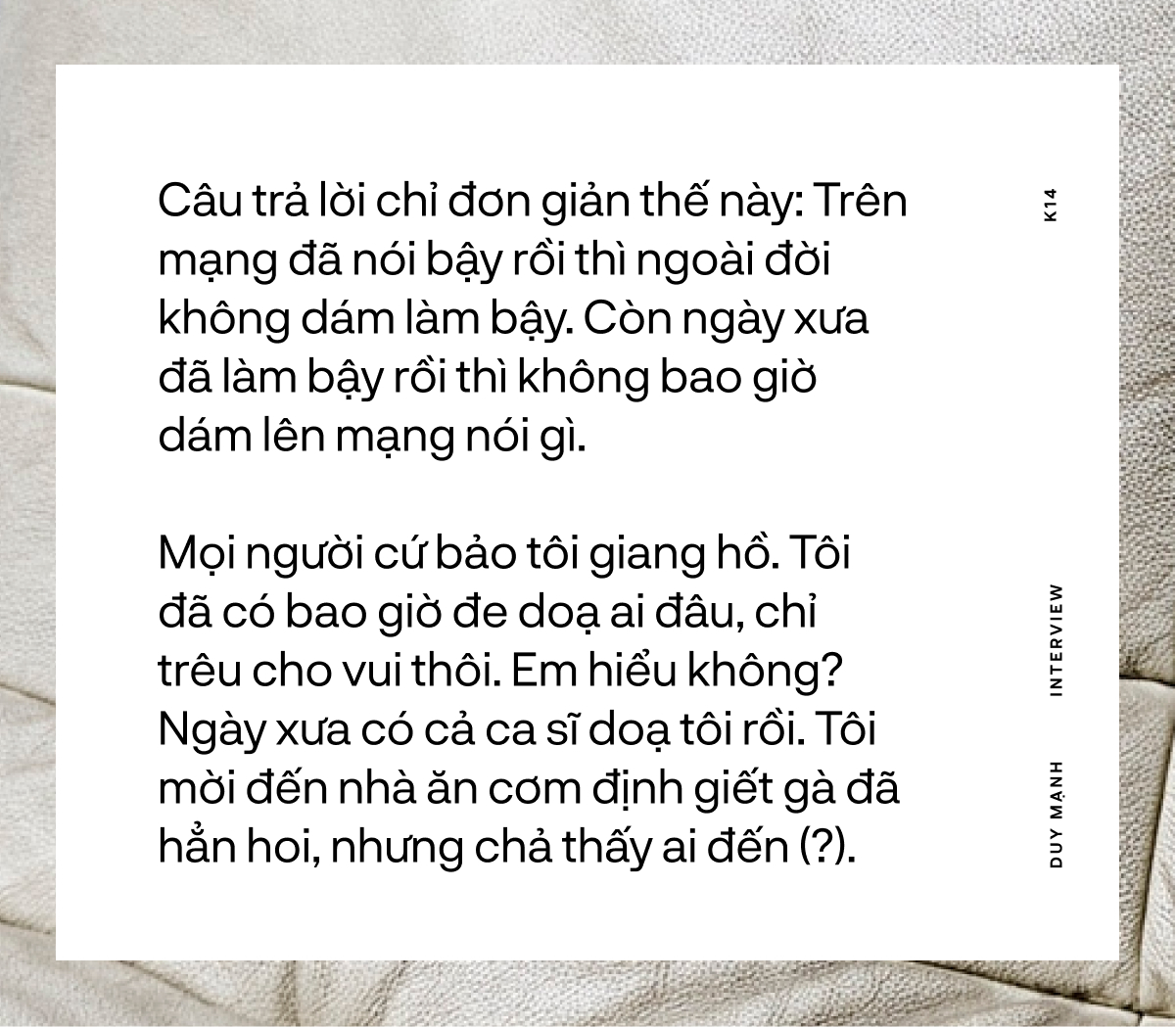 Mọi người cứ bảo tôi giang hồ. Tôi đã có bao giờ đe doạ ai đâu, chỉ trêu cho vui thôi. Em hiểu không? Ngày xưa có cả ca sĩ doạ tôi rồi. Tôi mời đến nhà ăn cơm định giết gà đã hẳn hoi, nhưng chả thấy ai đến (?).
