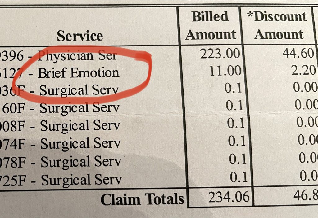 Chuyện là cô Midge đã đến bệnh viện để làm phẫu thuật tẩy nốt ruồi, một cuộc tiểu phẫu đơn giản với chi phí tương đối khá rẻ. Trong quá trình phẫu thuật, cô Midge cảm thấy hơi đau và lo lắng nên đã khóc. Đến khi thanh toán, cô Midge đã rất bất ngờ khi thấy khoản phụ phí $11 cho “cảm xúc ngắn”. Quá bức xúc, cô đã đăng tải hình ảnh tờ hoá đơn và mỉa mai rằng: “Loại bỏ nốt ruồi $223, và thêm phụ phí vì… khóc.”