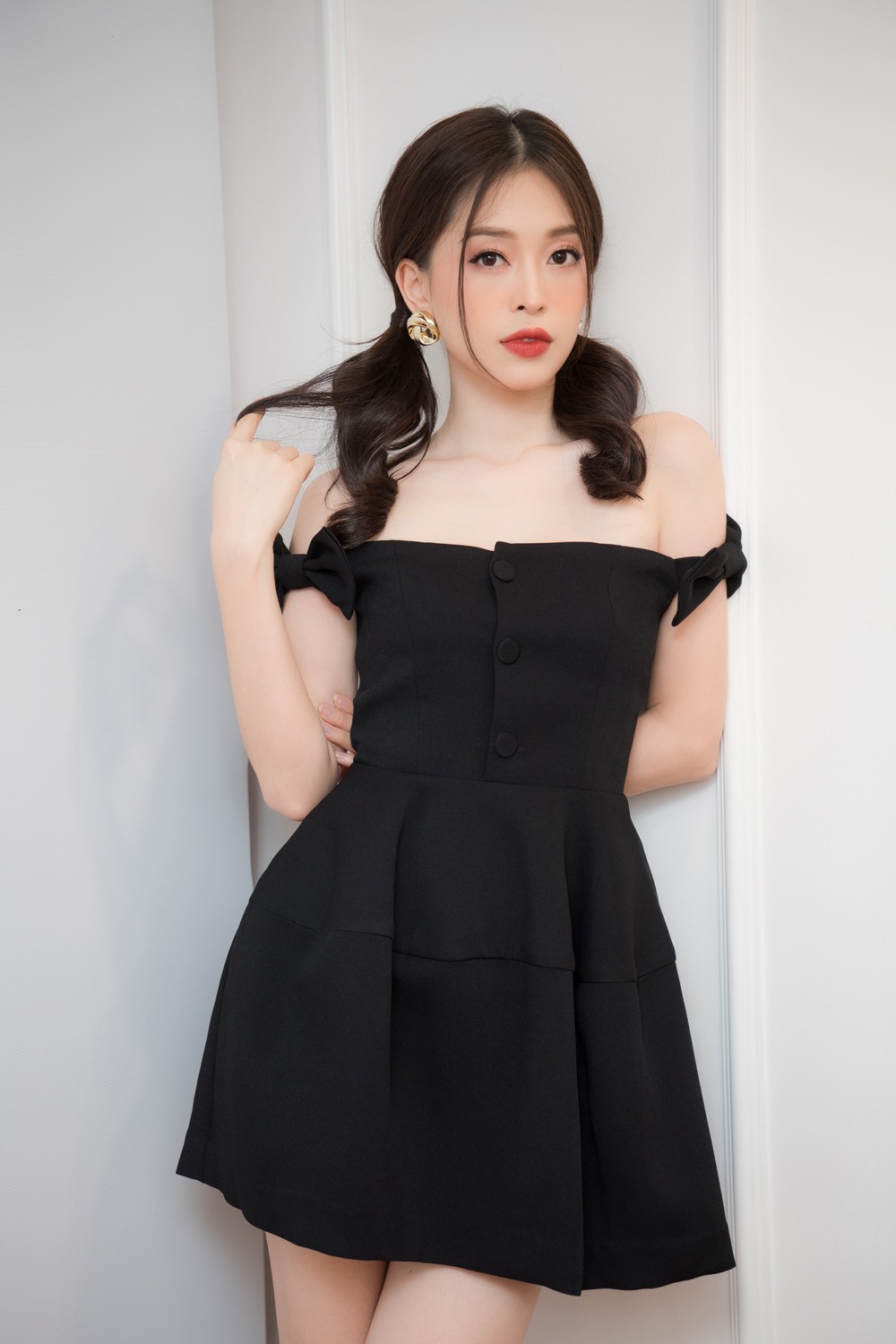 Á hậu Phương Nga diện thiết kế đầm trễ vai màu đen đơn giản.