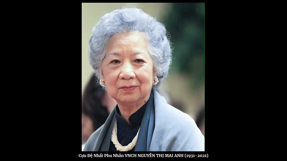 Bà Nguyễn Thị Mai Anh là phu nhân cố Tổng Thống VNCH Nguyễn Văn Thiệu, nền Cộng Hòa của Miền Nam Việt Nam 1955-1975, chỉ có duy nhất một Đệ Nhất Phu Nhân: Bà Nguyễn Thị Mai Anh vừa qua đời vào sáng Thứ Sáu, 15 Tháng Mười, tại nhà riêng ở Đông Bắc San Diego County, Nam California, hưởng thượng thọ 91 tuổi.
