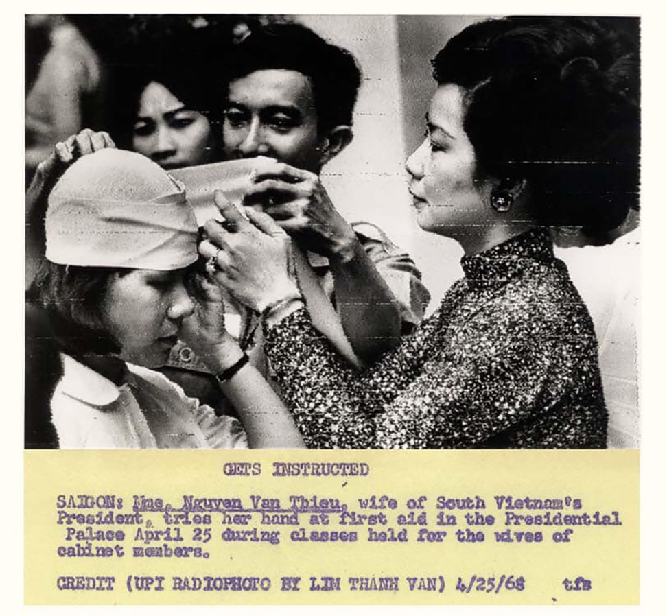 Bà Nguyễn Văn Thiệu (phải), vợ của Tổng thống Việt Nam Cộng hòa, học cách băng bó vết thương trong buổi tập huấn sơ cứu được tổ chức tại Dinh Độc Lập của Tổng thống ở Sài Gòn. Bên trái là Trung úy Trần Bình Điệp, một bác sĩ quân đội đã chỉ thị cho Đệ nhất phu nhân và vợ của hầu hết các bộ trưởng nội các – Ảnh: Douglas Pike