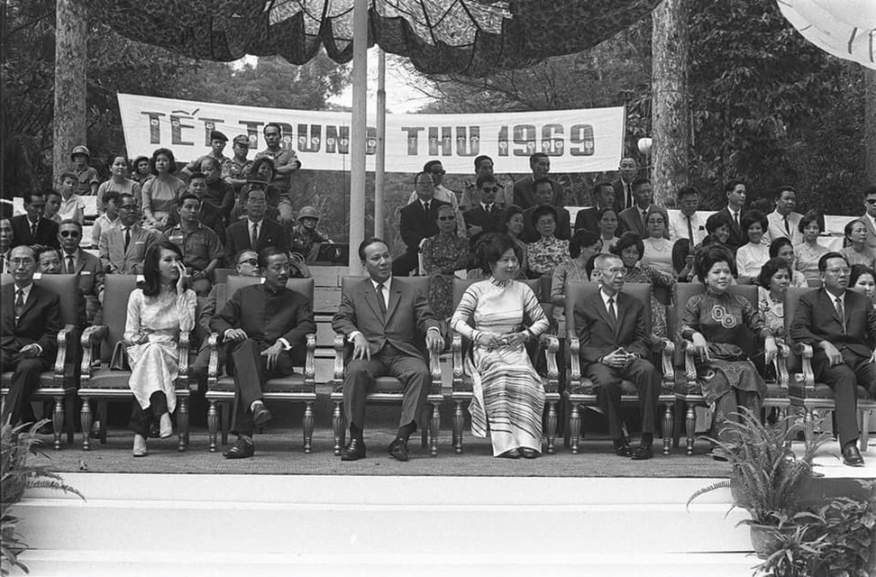 Các nhà lãnh đạo VNCH vui Tết Trung thu với thiếu nhi trong vườn Tao Đàn. Từ trái qua: Dân biểu Nguyễn Bá Lương Chủ tịch Hạ Viện, Bà Tuyết Mai và Phó TT Kỳ, TT Thiệu và phu nhân là Bà Mai Anh, Nghị sĩ Nguyễn Văn Huyền Chủ tịch Thượng Viện, Bà Trần Thiện Khiêm và Thủ tướng Khiêm.