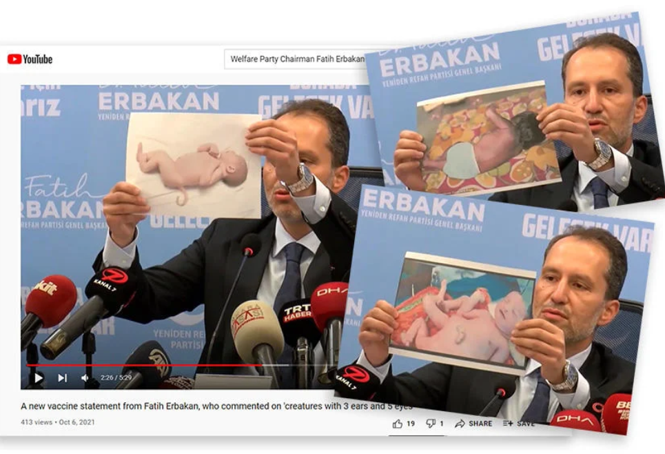 Another video circulating shows Turkish Welfare Party Chairman Fatih Erbakan saying, "This is not a vaccine but a genetic modifier." He holds up images of babies, claiming they are examples of what could happen. This video is being shared outside Turkey on such sites as stopworldcontrol.com and BitChute.