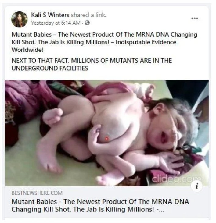 The claim appears in a video (archived here) published by bestnewshere.com on October 11, 2021, under the title "Mutant Babies -- The Newest Product Of The MRNA DNA Changing Kill Shot. The Jab Is Killing Millions! -- Indisputable Evidence Worldwide! Must See Videos!" It opened: