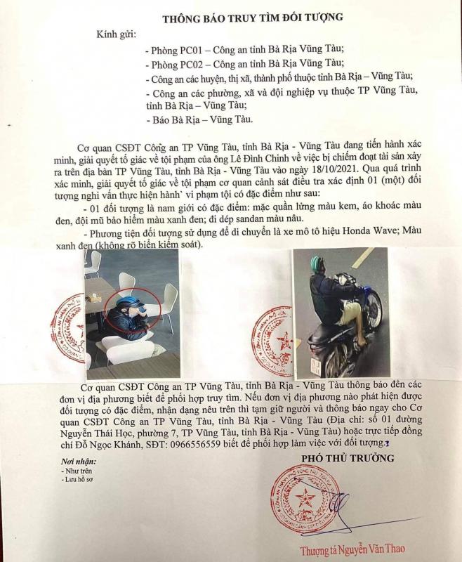 Khi đến số 57 Lê Hồng Phong nhưng không thấy đối tượng và gọi điện thoại không liên lạc được, ông Chinh quay lại cửa hàng 93 Lê Lợi thì mới biết mình bị lừa nên trình báo cơ quan Công an. Theo Cơ quan CSĐT Công an TP Vũng Tàu, đây là thủ đoạn mới của các đối tượng lừa đảo, người dân cần nâng cao cảnh giác.Qua quá trình xác minh, giải quyết tố giác về tội phạm, Cơ quan CSĐT xác định một đối tượng nghi vấn thực hiện hành vi phạm tội có đặc điểm như sau: Là nam giới có đặc điểm mặc quần lửng màu kem, áo khoác màu đen, đội mũ bảo hiểm màu xanh đen, đi dép sandan màu nâu. Phương tiện đối tượng sử dụng để di chuyển là xe mô tô hiệu Honda Wave, màu xanh đen (không rõ biển kiểm soát).