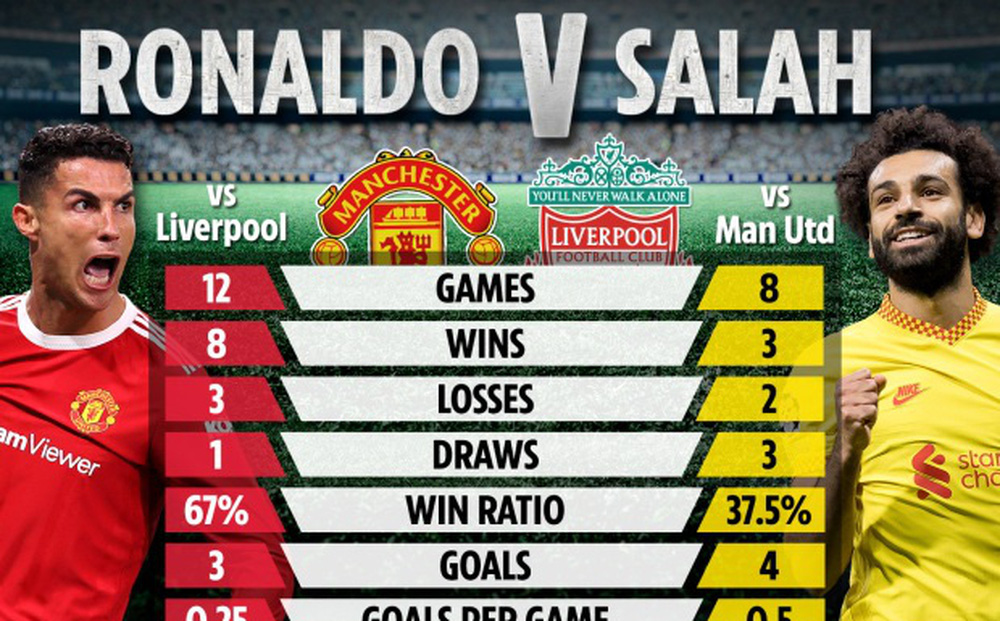 Tuy nhiên, hiệu suất ghi bàn của Ronaldo ở derby nước Anh lại kém xa Salah. Cụ thể, Ronaldo chỉ ghi được 3 bàn sau 12 trận gặp Liverpool, trong khi Salah có 4 bàn sau 8 lần chạm trán M.U. Hiệu suất ghi bàn của Ronaldo là 0,25 bàn/trận, còn con số này của Salah là 0,5.