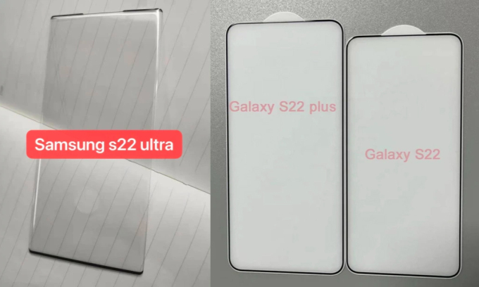 Ảnh mặt kính được cho là của loạt Galaxy S22 cho thấy phiên bản Ultra có thiết kế vuông vắn, trong khi 2 mẫu c̣n lại có viền bo cong.