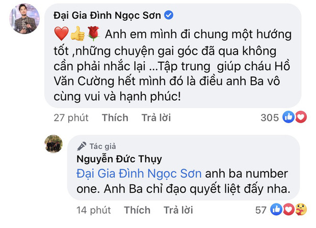 Tuyên bố của bầu Thụy nhận được nhiều sự tán thưởng và lời cảm ơn từ dân mạng. Dưới phần bình luận, danh ca Ngọc Sơn cũng có động thái ủng hộ người em kết nghĩa. Nam ca sĩ chia sẻ: “Anh em mình đi chung một hướng tốt, những chuyện gai góc đã qua không cần phải nhắc lại. Tập trung giúp cháu Hồ Văn Cường hết mình, đó là điều anh Ba vô cùng vui vẻ và hạnh phúc”. Sau đó, giọng ca “Tình cha” cũng đã chia sẻ lại bài đăng của bầu Thụy trên Fanpage Đại Gia Đình Ngọc Sơn: “Hồ Văn Cường con ơi, một tương lai tươi đẹp đang rộng mở chào đón con với hàng triệu trái tim luôn biết yêu thương và đùm bọc lẫn nhau, trong đó có tình của hai chú Ngọc Sơn và bầu Nguyễn Đức Thụy”. Được biết, bầu Thụy từng liên hệ với Ngọc Sơn để nhờ anh tìm địa chỉ và cách kết nối với Hồ Văn Cường để trực tiếp trao đổi về chuyện giúp đỡ, cũng như giúp nam ca sĩ sinh năm 2003 xây dựng một đội ngũ riêng.