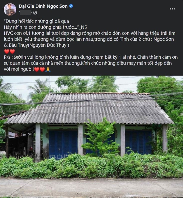 Cụ thể, Ngọc Sơn viết: “Đừng hối tiếc những gì đã qua. Hãy nhìn ra con đường phía trước” – NS. Hồ Văn Cường con ơi, 1 tương lai tươi đẹp đang rộng mở chào đón con với hàng triệu trái tim luôn biết yêu thương và đùm bọc lẫn nhau, trong đó có tình của 2 chú: Ngọc Sơn và bầu Thụy (Nguyễn Đức Thụy). P/s: Xin vui lòng không bình luận đụng chạm bất kỳ 1 ai nhé. Chân thành cảm ơn sự quan tâm của cả nhà mến thương. Kính chúc những điều may mắn tốt đẹp đến với mọi người”.