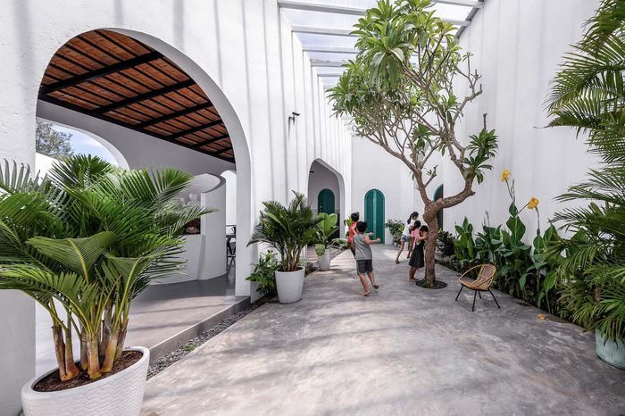 Phía ngoài cùng của cả hai khối nhà là một sân vườn rộng lớn. Như vậy, cả khu nhà có đến 4 khoảng sân gồm khoảng sân từ cổng chính đến cửa chính, khoảng sân ở hành lang lớn, khoảng sân nhỏ ngoài phòng khách và sân chơi lớn sau nhà.