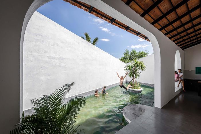Dọc theo khối phòng này là một bể bơi, rất thuận tiện để mọi người vừa sinh hoạt chung trong nhà, vừa quan sát được các hoạt động bên ngoài.