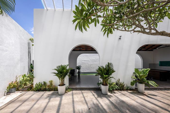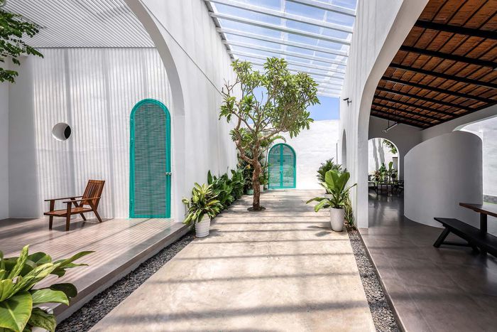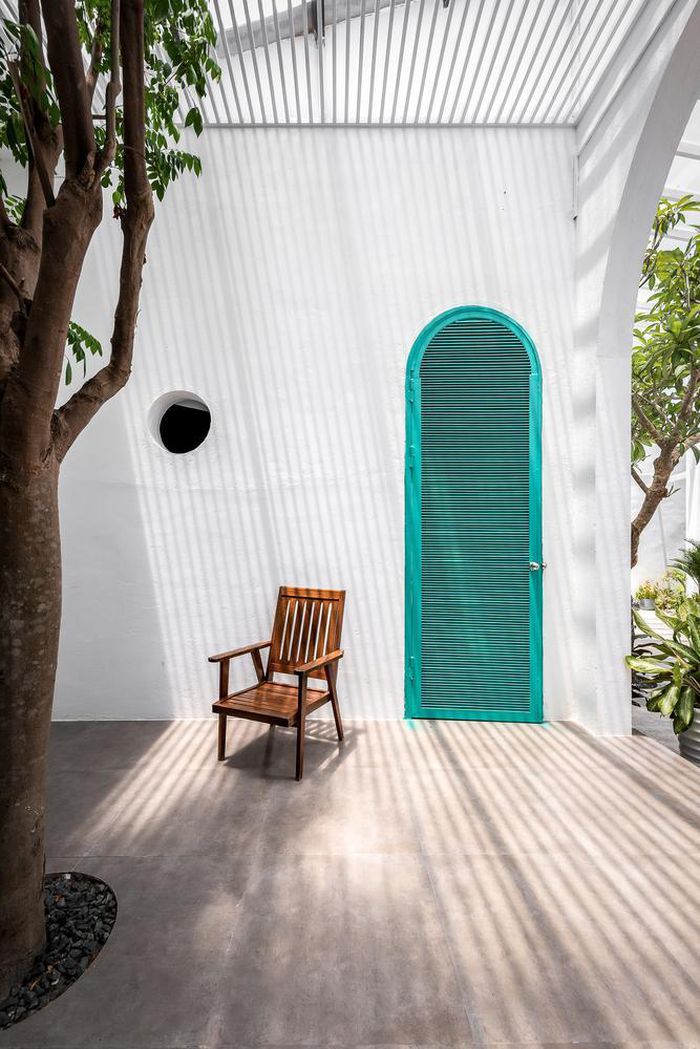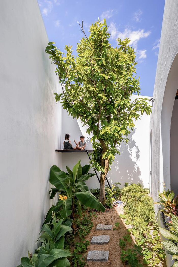 Do chi phí đầu tư và kỹ thuật thi công cửa kính khổ lớn tại địa phương còn hạn chế, nhóm thiết kế không lắp kính cho những ô cửa mà xây thêm một lớp tường rào bao quanh, đảm bảo an toàn và riêng tư.