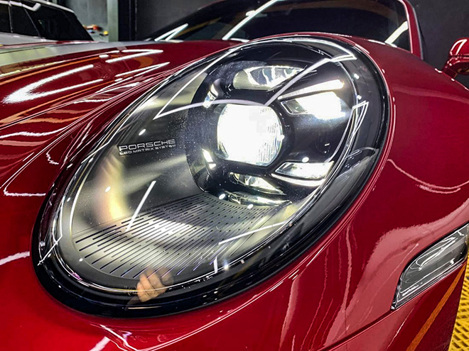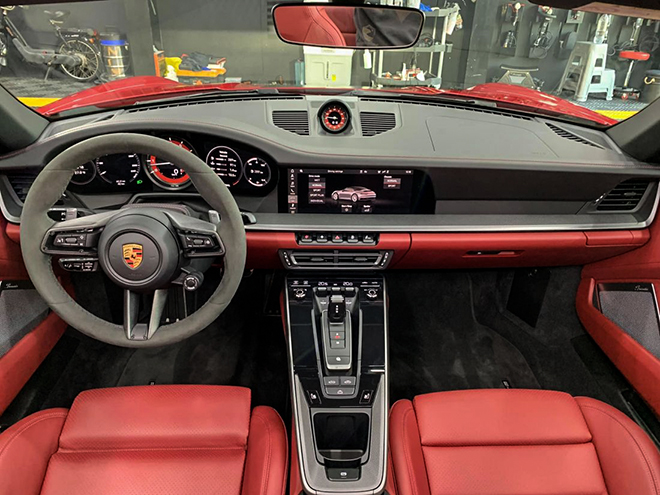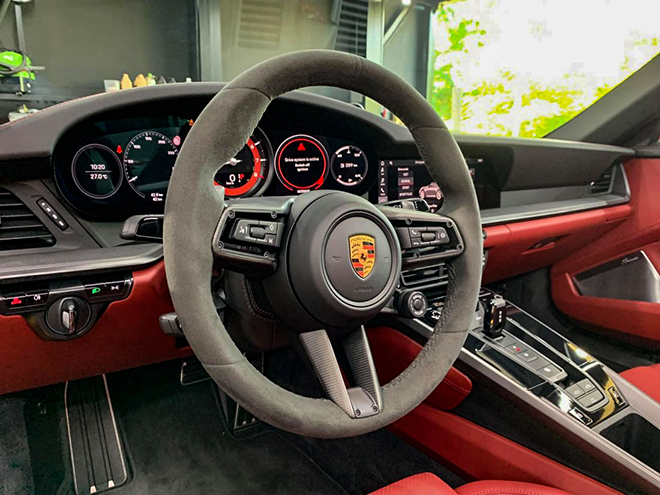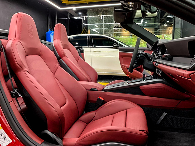 Nội thất được ốp sợi carbon mờ ở bảng điều khiển trung tâm và bảng táp lô trị giá 116,1 triệu đồng, bệ cửa ốp sợi carbon với logo 911 phát sáng giá 65,8 triệu đồng. Việc tùy chọn thêm logo Porsche dập chìm trên tựa đầu cũng tốn của chủ xe thêm 14,7 triệu đồng, trụ lái bọc da cao cấp tốn 23,2 triệu đồng, mặt đồng hồ vòng tua và đồng hồ Chrono sơn đỏ, giá tổng cộng 44,8 triệu đồng, ghế sưởi và làm mát tốn thêm hơn 100 triệu.