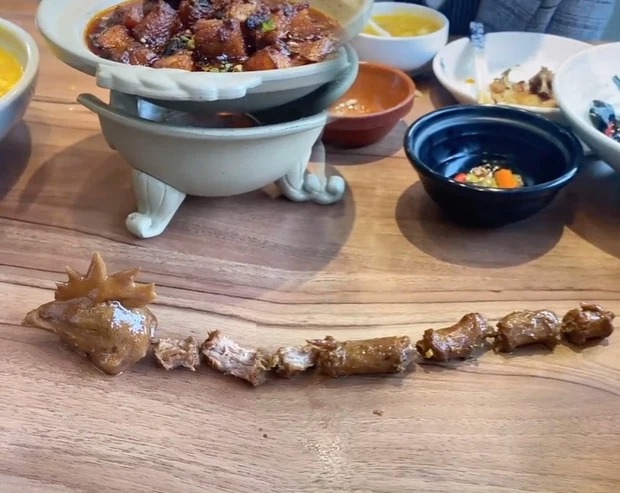 Sau khi mọi người ngồi cùng mâm đã tìm hết những miếng cổ (đã được chặt ra) để ghép lại cùng chiếc đầu gà thì phát hiện ra một con gà có chiếc cổ vô cùng kì dị.