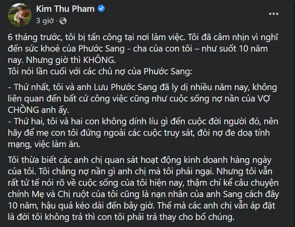 Nữ diễn viên tiết lộ dù cô đã ly hôn gần 10 năm nhưng những chủ nợ của chồng cũ vẫn tìm tới cô để tấn công, đe dọa: "6 tháng trước, tôi bị tấn công tại nơi làm việc. Tôi đã câm nhịn vì nghĩ đến sức khoẻ của Phước Sang - cha của con tôi – như suốt 10 năm nay. Nhưng giờ thì không!"