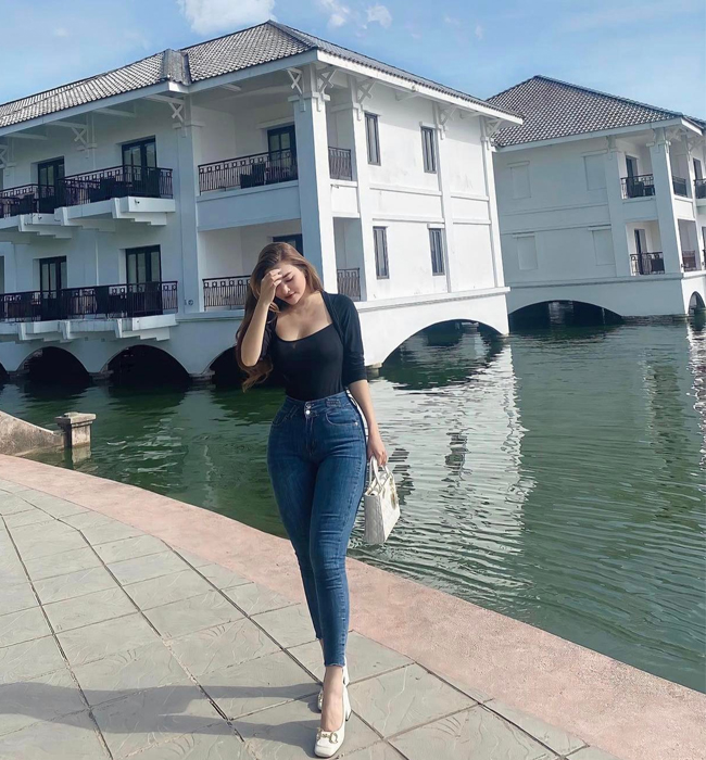 Chẳng những mặc quần jean đẹp, Duyên còn kết hợp với những thiết kế áo ngắn, hở, phô từng đường nét cơ thể quyến rũ.