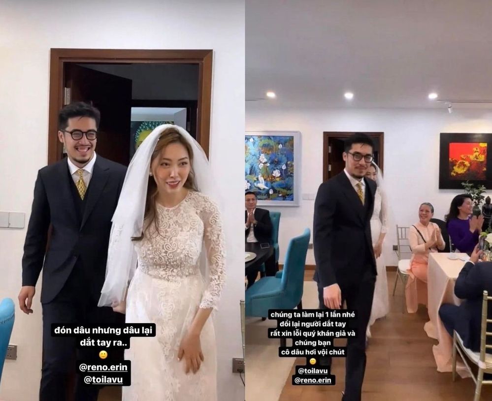 Trong ngày vui, cặp đôi đã gặp phải sự cố hài hước. Theo phong tục truyền thống, chú rể sẽ nắm tay cô dâu ra chào khách mời nhưng Nguyễn Hằng lại chủ động dắt ông xã đi trước. Vì sự sai sót này nên cặp đôi phải quay về phòng cô dâu để thực hiện lại cho đúng nghi thức.