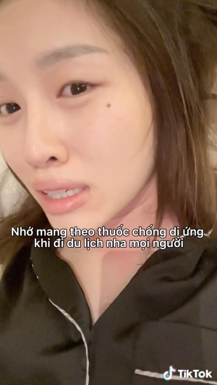 Dù quê gốc ở Nha Trang, nữ MC xinh đẹp vốn quen ăn hải sản từ bé nhưng lần này lại bị dị ứng. Kết quả là mặt mũi sưng húp, mẩn đỏ nổi khắp nơi, ngứa ngáy khắp người tới nỗi mất ngủ.